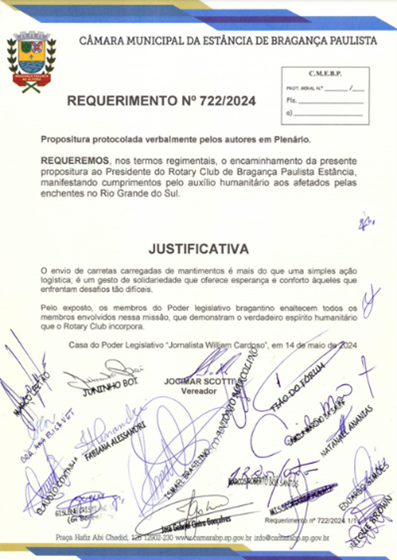 Reconhecimento da Câmara Municipal de Vereadores de Bragança Paulista pelos serviços prestados e envio de suprimentos as enchentes do RS, onde o clube enviou um caminhão bi trem carregado de água, mantimentos, roupas, comida para animais, aquecedores, dentre muitas outras coisas. Vale destacar que essa ação foi fortemente apoiada pela população, o que mostra a força e a credibilidade do Clube perante a sociedade bragantina.